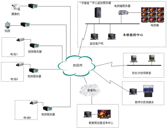 在每個考場教室安裝一個攝像機(jī)(可以加裝拾音器),一般采用固定攝像機(jī),特殊教室也可以采用可控?cái)z像機(jī),把攝像機(jī)視頻線纜、控制線纜等都連接到Grandtec網(wǎng)絡(luò)視頻服務(wù)器上, Grandtec網(wǎng)絡(luò)視頻服務(wù)器有網(wǎng)絡(luò)接口,可以直接連接到交換機(jī)上,把圖像及相關(guān)數(shù)據(jù)傳送到校園網(wǎng)絡(luò)上。