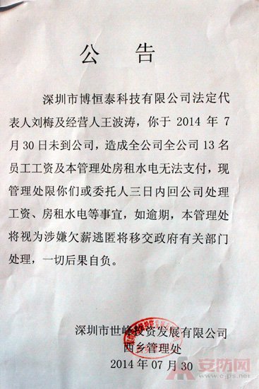 筆者詢問(wèn)深圳市世峰投資發(fā)展有限公司西鄉(xiāng)管理處。他們表示,深圳市勞動(dòng)局以及司法系統(tǒng)已經(jīng)介入,正在走司法程序,倘若中科視安負(fù)責(zé)人在三個(gè)工作日內(nèi)不發(fā)員工工資及繳清管理處費(fèi)用,將沒(méi)收廠房?jī)?nèi)資產(chǎn)。物業(yè)管理人員也向筆者透露,中科視安欠的物業(yè)管理費(fèi)也有幾十萬(wàn)元,此次老板失聯(lián),造成了多方損失。